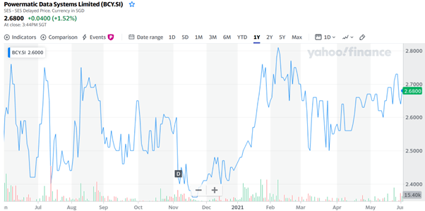 As a specific real-life example, let us take a look at Powermatic Data Systems Limited (SGX: BCY), a stock which I am currently analysing. Last year, Powermatic gave a dividend of 28.6 cents per share (more than 10% of the share price) with ex-date on 5 November 2020 and pay date on 17 November 2020. As you can see from the chart below, the share price plunged on 5 November 2020 by just about 28.6 cents (look for the black square with the ‘D’).