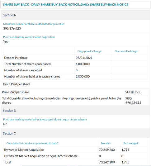 One company that does stock buy-backs well is Yangzijiang Shipbuilding Holdings Limited (SGX: BS6). Yangzijiang usually buys back stock when the share price is around $1 or lower. Below is an example of a share buy-back notice from Yangzijiang on 7 January 2021.