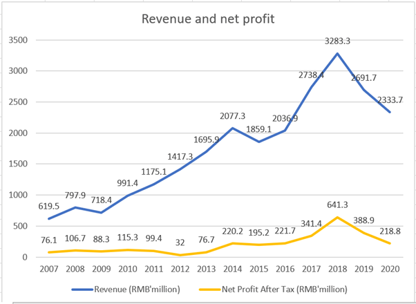 Figure 3 below shows China Sunsine’s revenue and net profit from FY2007 to FY2020. A clear upwards trend in revenue can be observed, whereas profit growth is not very steady.