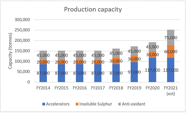 This is timely because as of FY2020, the utilisation rate for accelerators, insoluble sulphur, and anti-oxidant was 78%, 102%, and 102% respectively (source here) . It is therefore likely that the additional capacity will be soaked up when the expansions come online, resulting in a boost to revenue and profit.