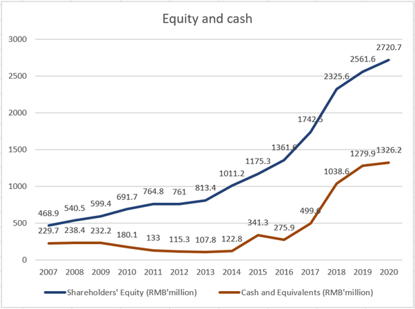 Figure 5 below shows the shareholders’ equity and cash of China Sunsine from 2007 to 2020.